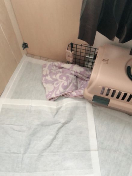 帰ってきてすぐに、クレートにひいていたタオルケットを洗濯し、バスタオルを代わりに入れておきました。